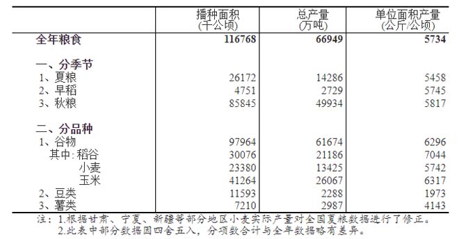 全國(guó)糧食總產(chǎn)量為31個(gè)省(區(qū)、市)夏糧、早稻和秋糧產(chǎn)量的總和。